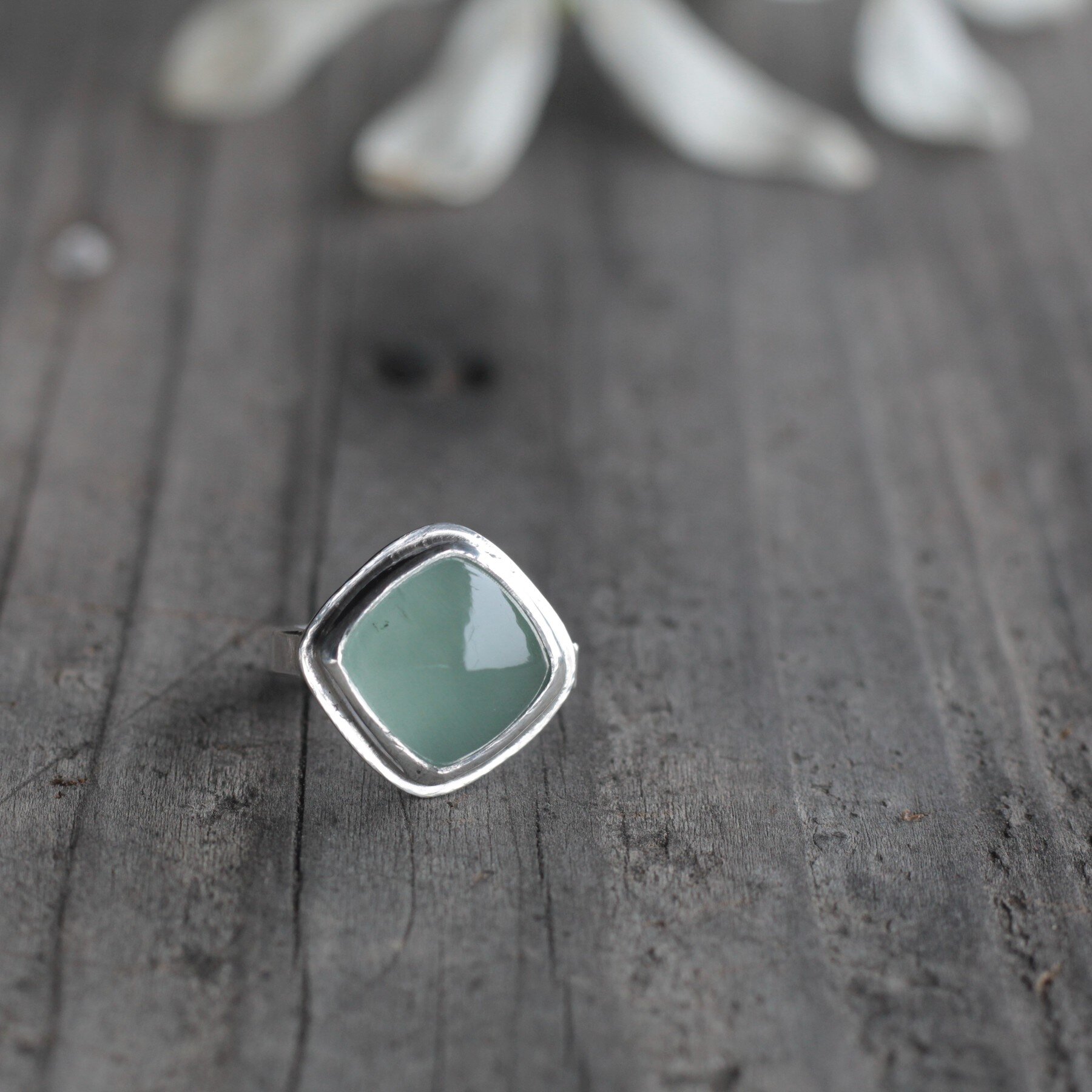A pyramidal cabochon of natural aquamarine set in a handmade, sterling silver and file silver ring. Square ring band wire, size 7. Resembling and named for the waters of the sea, aquamarine has a reputation for protection on many levels and for supporting the intellect. Aquamarine is the birthstone for those born in March.